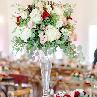 Sterling Event Venue provided an enchanting backdrop for these two couples. Nestled among picturesque landscapes, Valerie and Daniel had a gorgeous ceremony on the outdoor lawn. The venues existing rustic arch was adorned with burgundy and blush toned floral with touches of greenery. Our team decorated the back row of chairs with chiffon draping and faux floral to further tie in their colors. Valerie walked down the long, winding aisle and over a stone bridge to “Canon In D” and met her now husband, Daniel, with their closest family and friends surrounding them. Witnessing all the love that their families had for each other was something I will never forget!